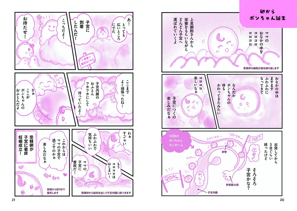 天界でママとパパを見つけ、受精卵になるところからストーリーが始まります。まんがはすべて赤ちゃん目線。テレビや雑誌でも人気の産婦人科医で3児のママである著者の善方裕美先生が、いつかこんなまんがを描いてみたかった! という思いからシナリオを執筆。アメブロ公式ブロガーでインスタフォロワー11.4万人、4児のママであるリコロコさんがまんが化しました。主人公である胎児・ポンちゃんからの「ママ~ここにいるよ~」というメッセージを強く感じながら、出産を乗り切ることができます。