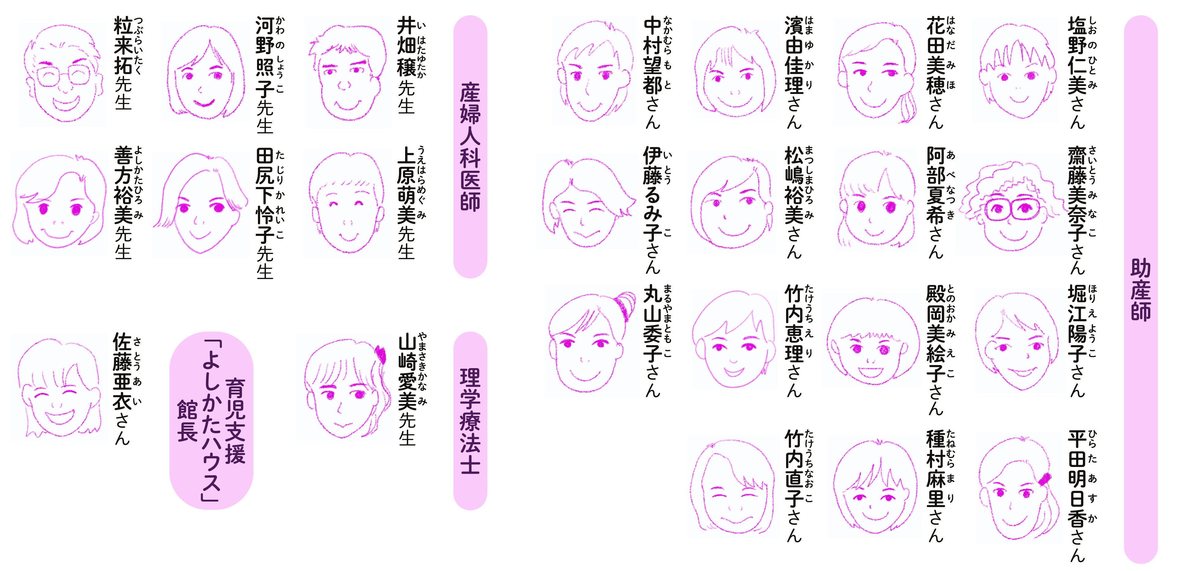 年間700件の出産をあつかう「よしかた産婦人科」のスタップ23名が、それぞれの専門領域から、ママに知っていてほしいリアルな最新情報をしっかりまとめました。退院後の育児やママの体の回復までフォローします。