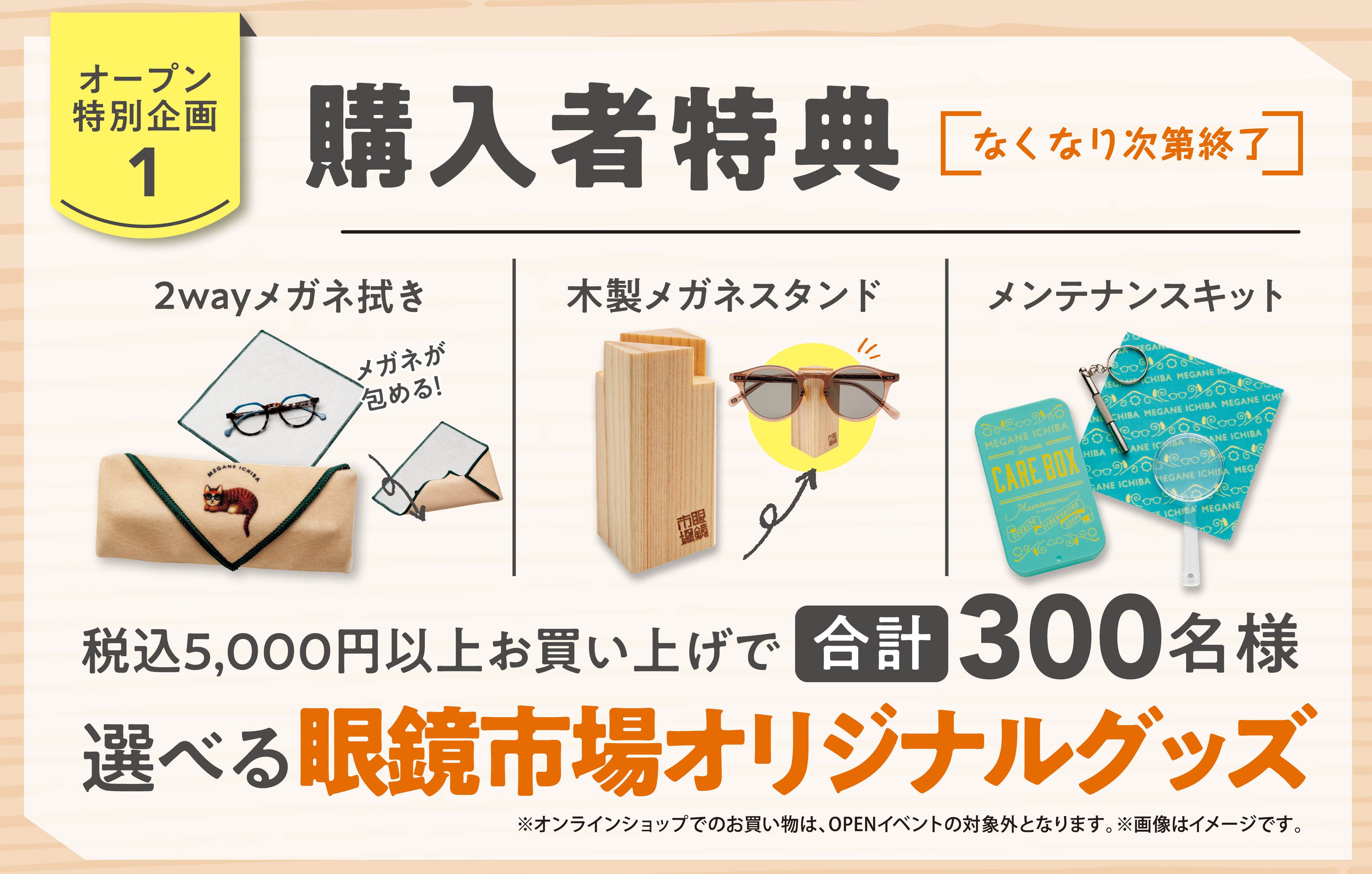 期間中、5,000円(税込)以上ご購入いただくと、お好きな眼鏡市場オリジナルグッズをお選びいただけます。