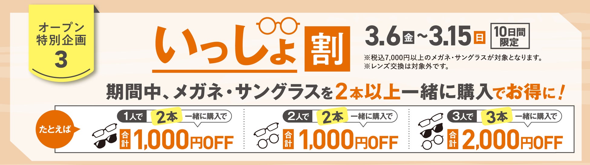 期間中、メガネ・サングラスを2本以上一緒にご購入いただくと、購入本数に応じた特典が受けられます。