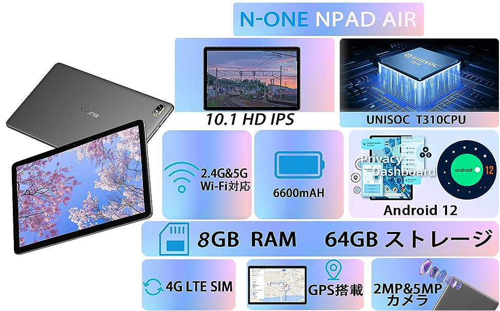 10.1インチ/ Android 12/ CPU T310 4コア/ 8GB(4+4拡張)RAM+64GB ROM/ 6600mAh/ 4G LTE通話/ 5MP+2MPカメラ