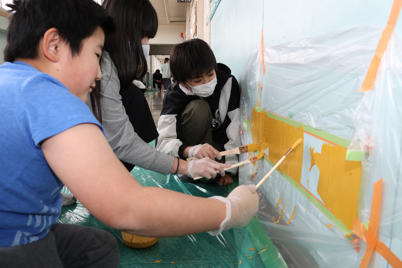 この日は、4・5・6年生の総勢約180人の児童がペイントを実施。同社の職人がペンキを上手に塗るための道具の使い方やコツをレクチャーし、教員が事前に準備した下書きをなぞるように、児童たちは矢印や同校マスコットキャラクターなどを慎重に塗っていきました。ペイントしたのは校舎内の全61か所。児童は、ムラが出ないよう何度も丁寧にペンキを塗ってきれいに仕上げました。