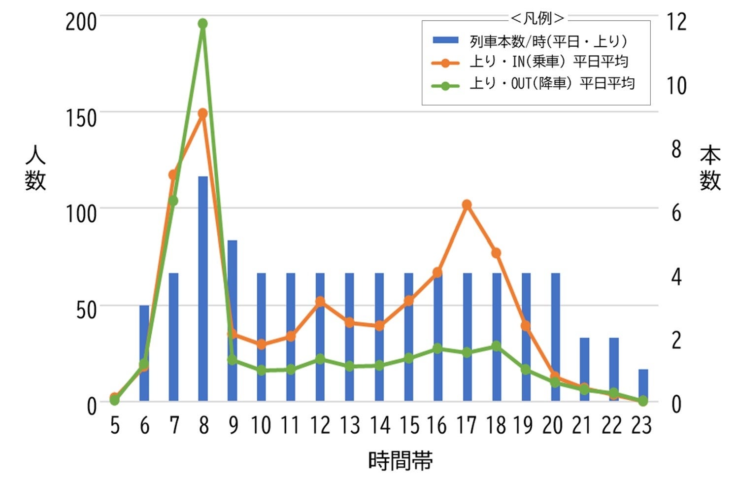 列車の乗車人数・降車人数を区別してカウントし、時間帯ごとの集計値(グラフ1)および乗降人数の平均値と列車本数の比較(グラフ2)をグラフ化しました。栗林公園駅における平日17時台の乗降人員が8時台の半数以下であることから、夕ラッシュにおける車両編成の削減が可能であることを導出しました。