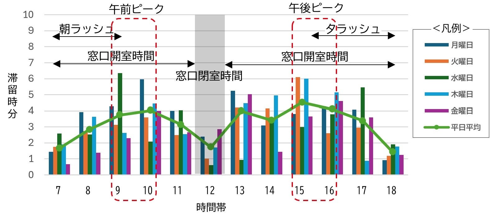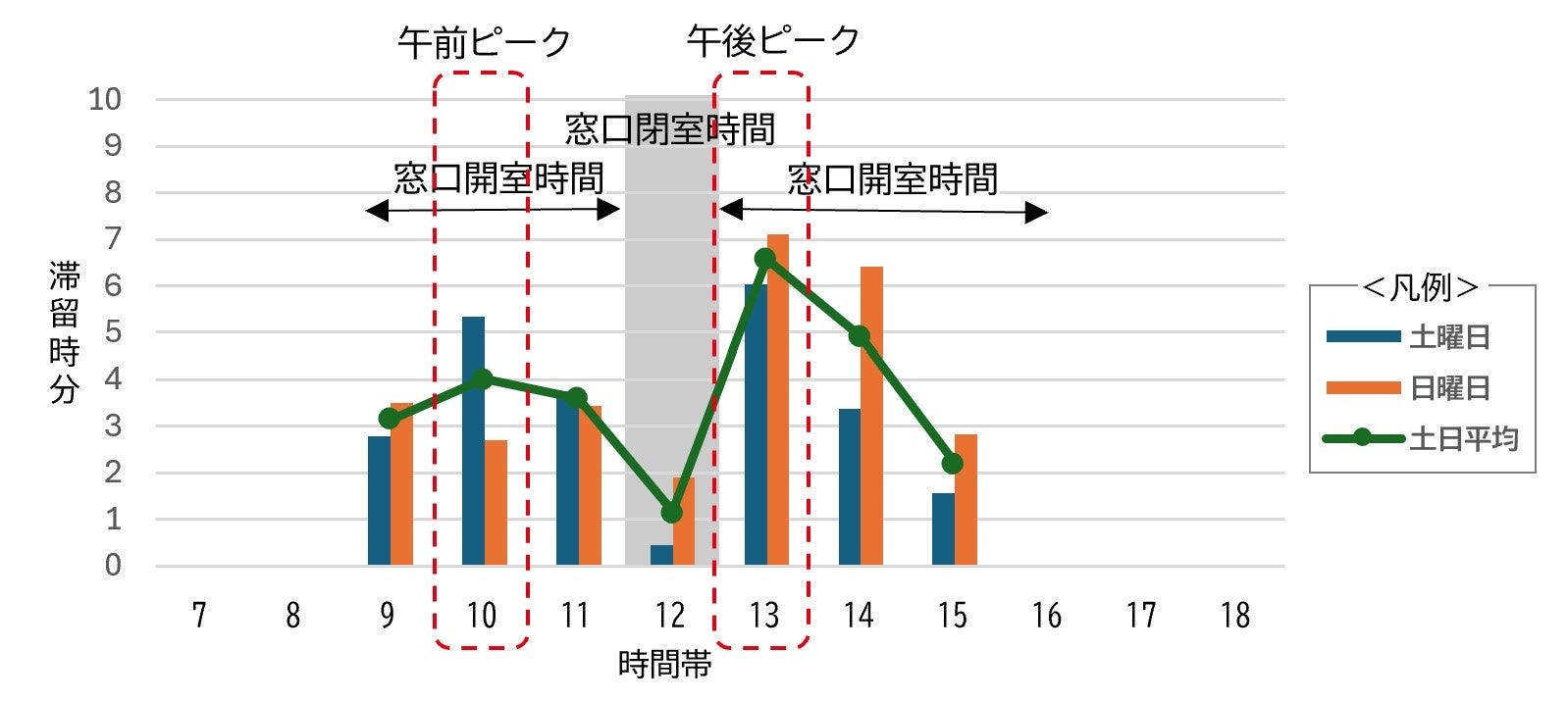 曜日・時間帯ごとの駅窓口利用者の滞留時間(グラフ3、4)を1時間単位でグラフ化し、平日・土日それぞれの混雑時間帯を分析した結果、平日の混雑時間帯は9~10時台と15~16時台である一方、土日の混雑時間帯は10時台と13時台であることが分かりました。曜日・時間帯ごとの混雑傾向を把握できたことから、窓口業務の人員配置計画策定において、カメラ映像から取得した滞留時間データを活用可能であることが確認できました。
