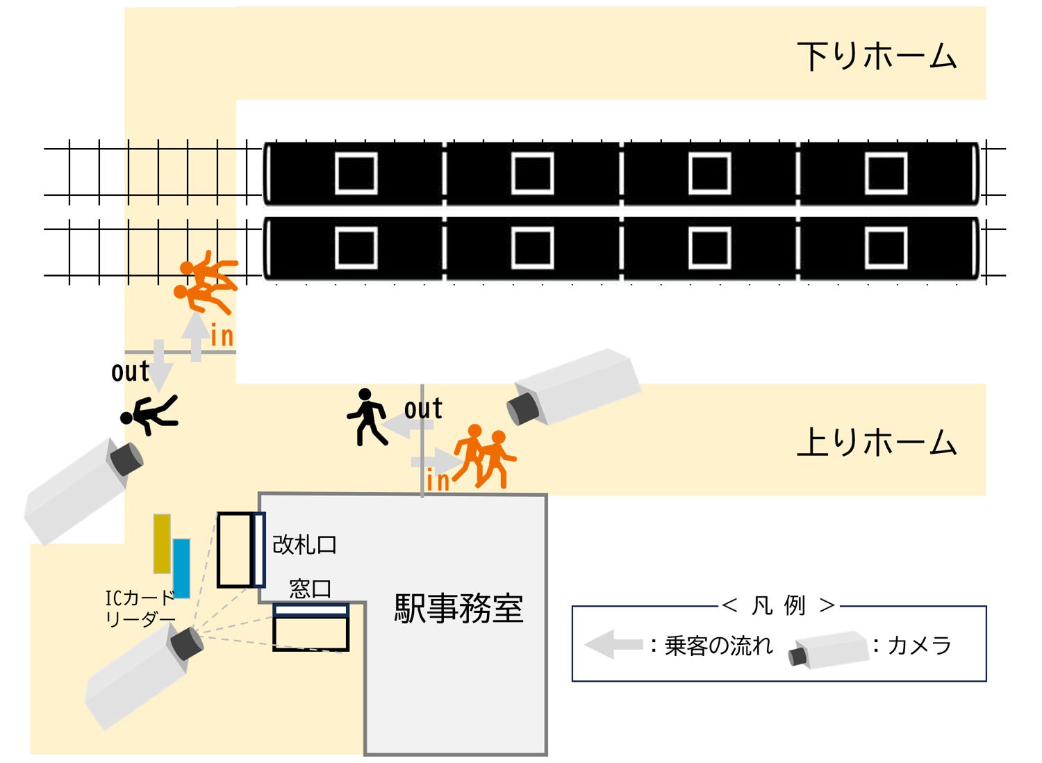 ・駅の上りホーム上および下りホームに向かう通路にカメラを1台ずつ設置。上りホームと下りホームそれぞれの乗降人数をカウント・グラフ化し、曜日・時間帯ごとの傾向から車両編成の改善案を策定 ・駅窓口付近にカメラを1台設置。窓口利用者の滞留時間をカウント・グラフ化し、曜日・時間帯ごとの傾向を分析 |