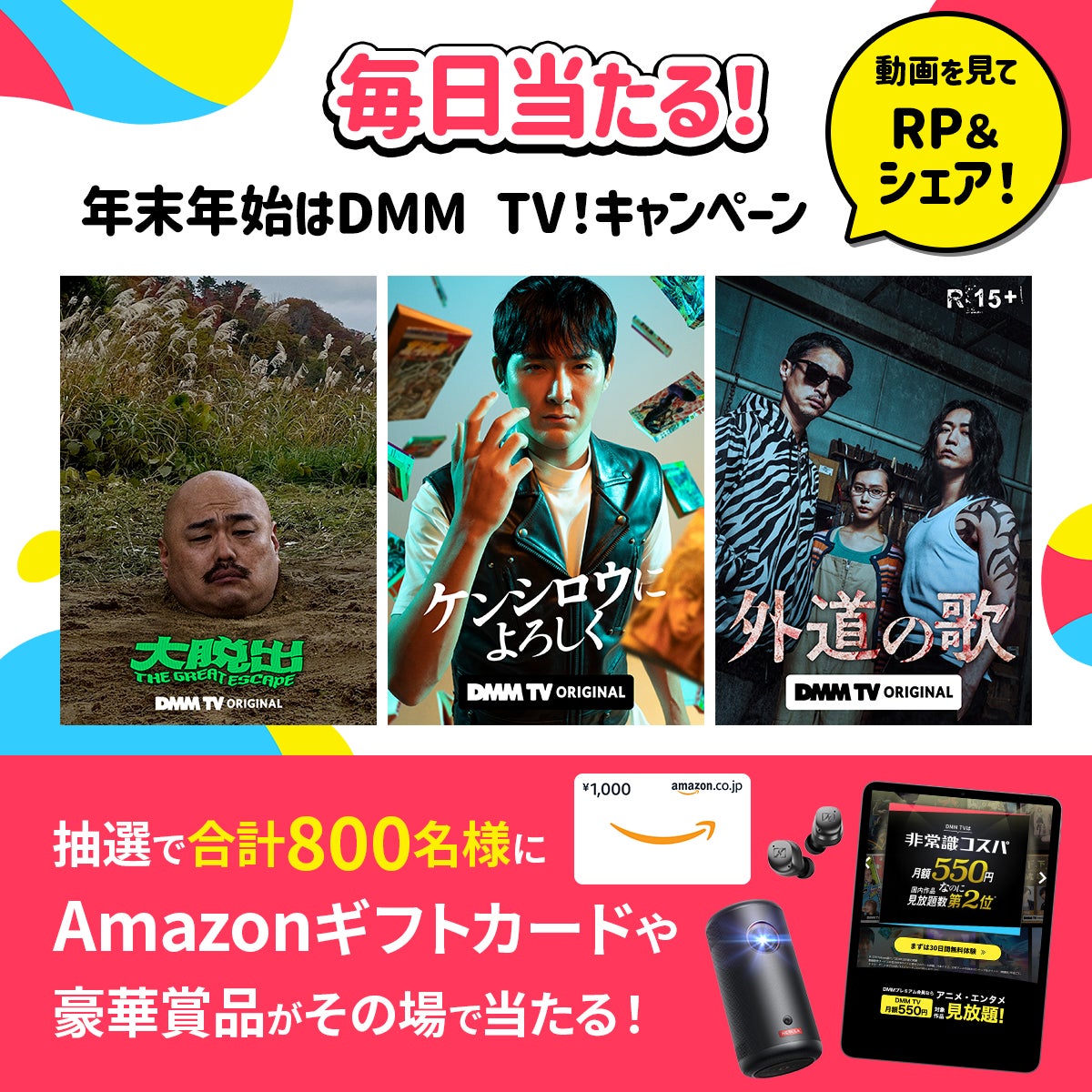 一挙公開を記念し、DMM TV公式Xでは800名様にAmazonギフトカードや豪華賞品がその場で当たるキャンペーンを開催いたします。ぜひ奮ってご参加ください。