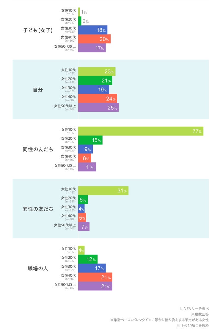 10代の女性では、「同性の友だち」が77%と、特に高い割合となっています。また、「父親」「異性の友だち」が3割台、「母親」が2割台となっており、ほかの年代と比べて高い割合でした。10代では、同性・異性に限らず友だち同士や家族で贈りあう人が多い傾向です。