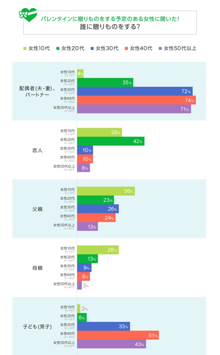 グラフにはありませんが、男性も20代以下では「恋人」、30代以上では「配偶者(夫・妻)、パートナー」の割合が高く、女性と同様の傾向がみられました。また、30代の男性は贈り相手として「子ども(女子)」の割合がほかの年代と比べて高い傾向にありました。