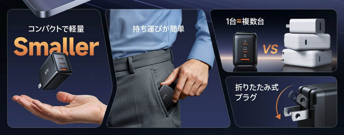 超小型で折りたたみ式プラグを採用し、5.25×3.9×2.8cmのコンパクトサイズはポケットにもすっぽり収まります。重量はわずか81gで、旅行や出張の際も荷物になりません。さらに、2つのType-Cポートと1つのUSB-Aポートを備え、最大3台のデバイスを同時に充電可能。これ1台で複数機器の充電ニーズに応え、デスク周りもすっきり整理できます。