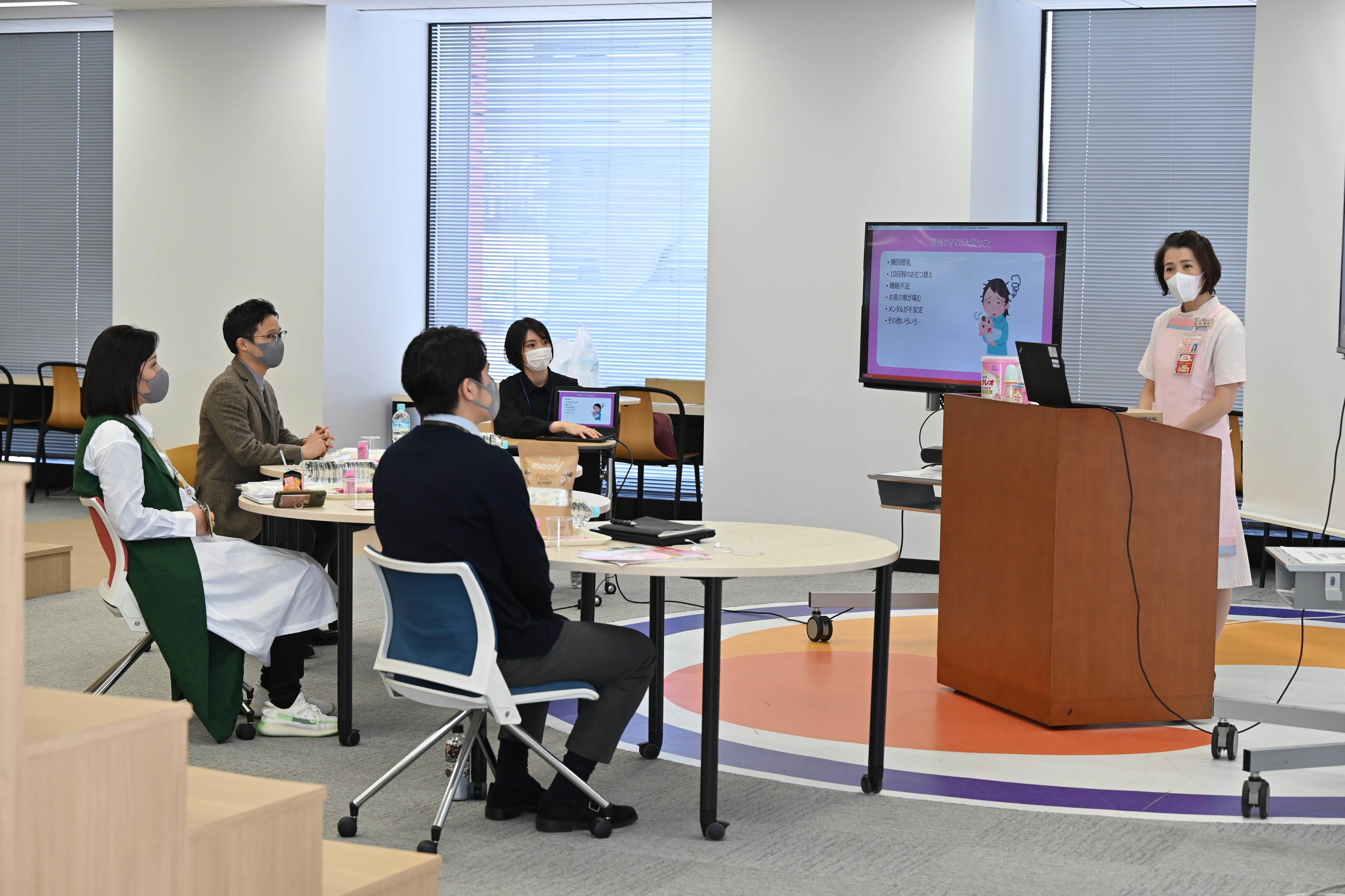 そこで、当社はユニ・チャームと協働で、企業向け両親学級 「みんなの育休研修」を無償で提供することにしました。研修では、産休取得予定者、育休取得予定者などを対象に、男性育児が子どもや家族に与える影響や、乳児期の育児で大きな負担となる“授乳”“睡眠”“排泄”の方法などについて、栄養士・子育てアドバイザーなどを交えながらご紹介します。