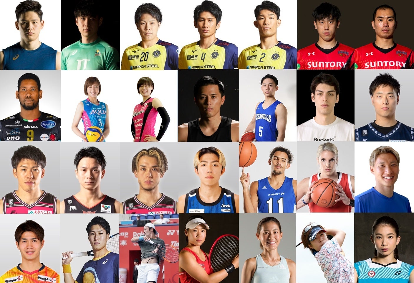 バレーボール:西田有志、小野寺太志、山本智大、髙野直哉、樋口裕希、大宅真樹、鶴田大樹、ウィルフレド・レオン、間橋香織、佐々木千紘/バスケットボール:富樫勇樹、河村勇輝、シェーファー アヴィ 幸樹、岡田侑大、保岡龍斗、津屋一球、伊藤駿、寺嶋恭之介、トレイ・ヤング、エレーナ・デレ・ダン/サッカー:畠中槙之輔、佐藤亮/テニス:綿貫陽介、伊藤竜馬、日比野菜緒/マラソン:岩出玲亜/ゴルフ:穴井詩/バドミントン:松友美佐紀 他アスリート・チーム多数