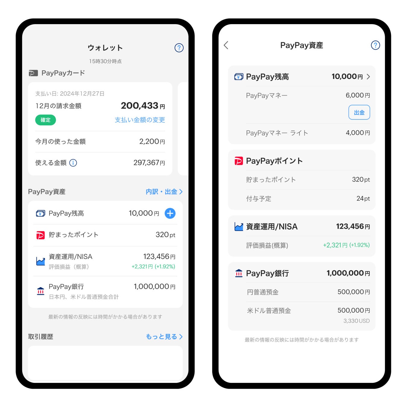 これまで「PayPay」の「ウォレット」では、PayPay銀行の預金情報は、円普通預金残高のみが表示されていましたが、2024年12月4日より順次、円普通預金と米ドル普通預金(円換算額)の合計が確認できるようになります。また、「PayPay資産」の画面では、この合計に加えて円普通預金と米ドル普通預金のそれぞれの残高が表示されるようになります。これにより、定常プログラム「預金革命」で特別金利が適用される預金残高を、すぐに確認できるようになります。