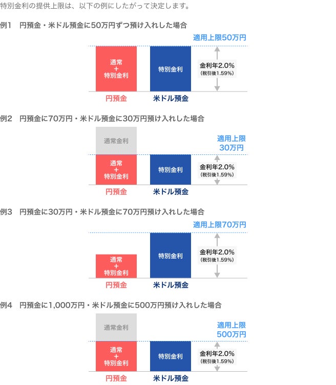 【特別金利】 円普通預金:通常金利+特別金利で合計 年2.0%(税引後 年1.59%) 米ドル普通預金:特別金利 年2.0%(税引後 年1.59%) ※金利は変動金利であり、金利情勢等により見直しを行います。 【対象残高】 ・円普通預金:米ドル普通預金の月中平均残高(円換算:毎日の最終預金残高は当日の米ドル/円の最終レートで算出)の範囲内(ただし円残高が500万円超の場合は500万円) ・米ドル普通預金:上限なし |