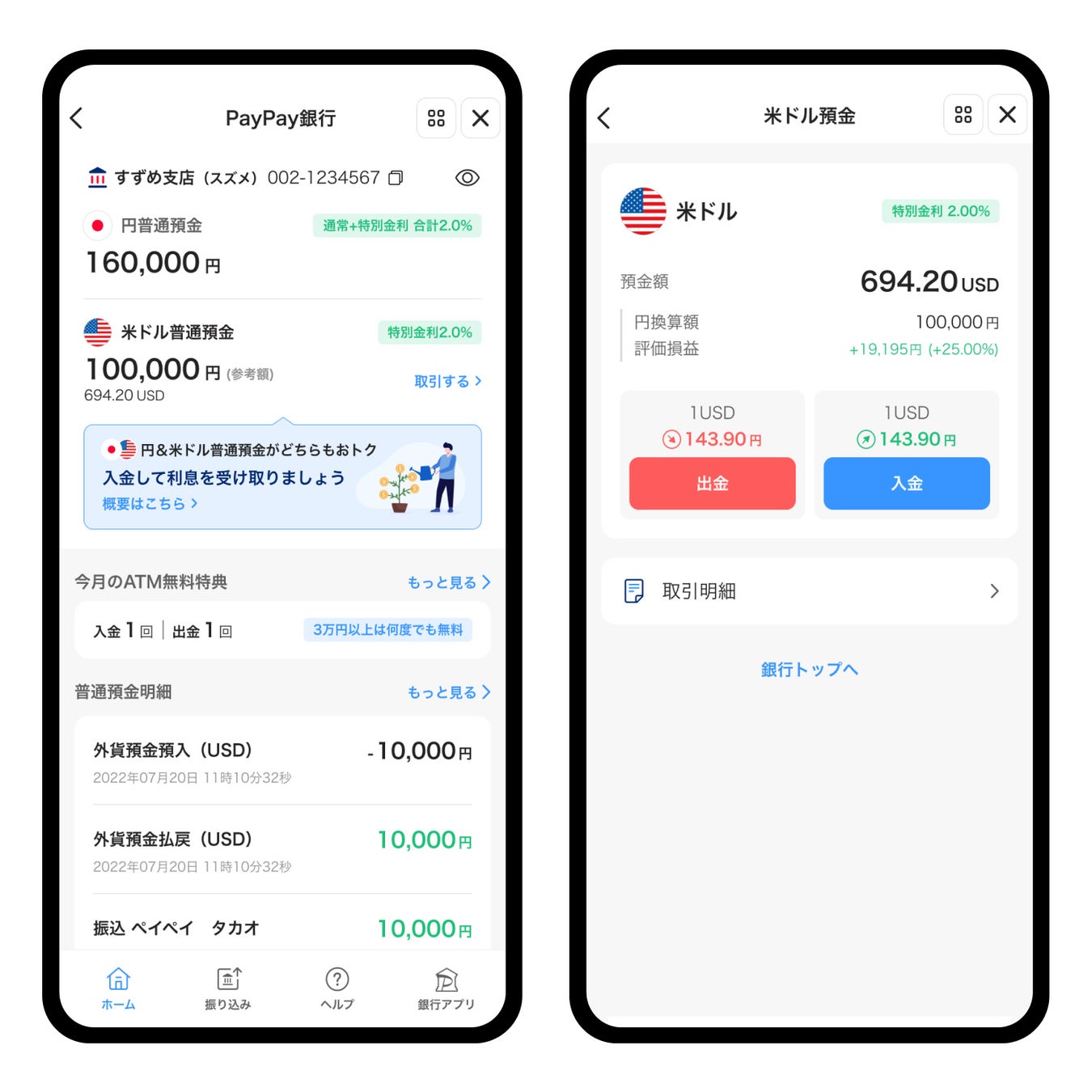 本プレスリリースは情報の提供のみを目的としております。外貨預金は、外貨建ての預金(預金保険の対象外の預金)であり、外国為替相場の動向等によっては、払戻時の円貨額が預入時の円貨額を下回る等、元本割れが生じるリスク等があります。また、預入時および払戻時には、為替手数料をご負担いただきます。預入レート(円貨から外貨に替えるレート)と払戻レート(外貨から円貨に替えるレート)には為替手数料が含まれており、通常時預入レートは払戻レートよりも高くなっています。そのため、外国為替相場に変動がない場合でも、払戻時の円貨額が預入時の円貨額を下回り元本割れが生じる可能性があります。 取引を開始するまたは継続して行う場合には、約款および商品説明書をよくお読みいただき、仕組みやリスクについて十分にご確認いただいたうえで、自己の責任においてお取引くださいますようお願い申し上げます。最新の金利はPayPay銀行ホームページの「金利」をご確認ください。