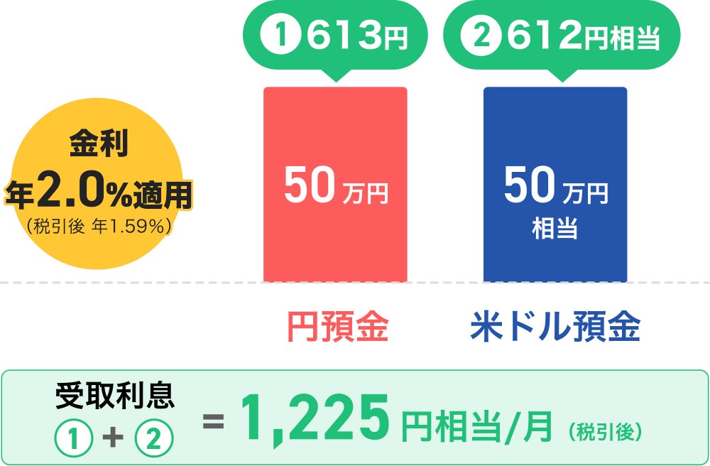 円普通預金と米ドル普通預金の両方に預け入れすることで、お客さまに年2.0%(税引後 年1.59%)の金利を適用します。例えば、円と米ドルをそれぞれ50万円ずつ(合計100万円)預け入れすると、12月は約1,220円(税引後)※6の利息を受け取ることができます。