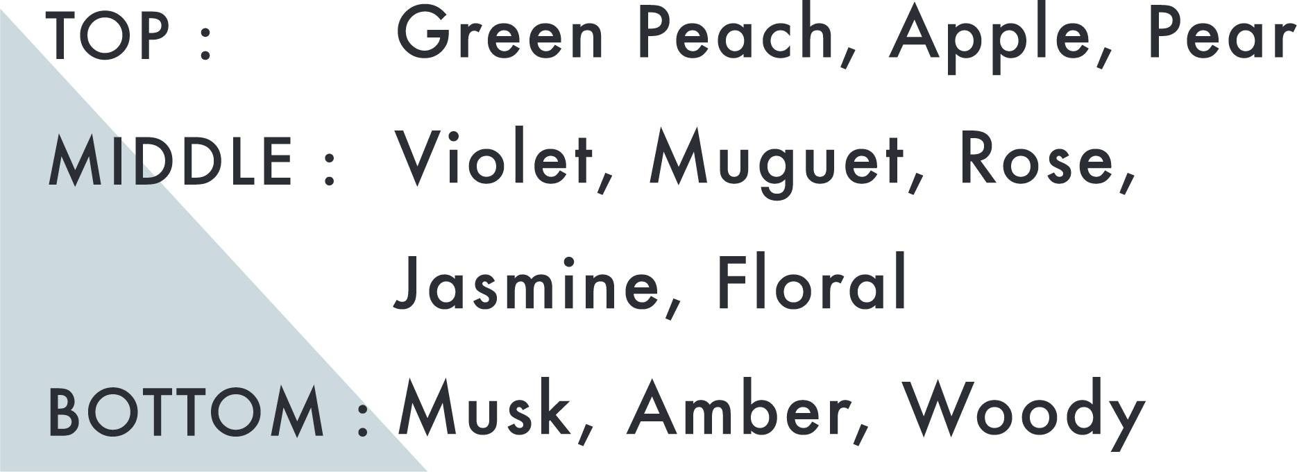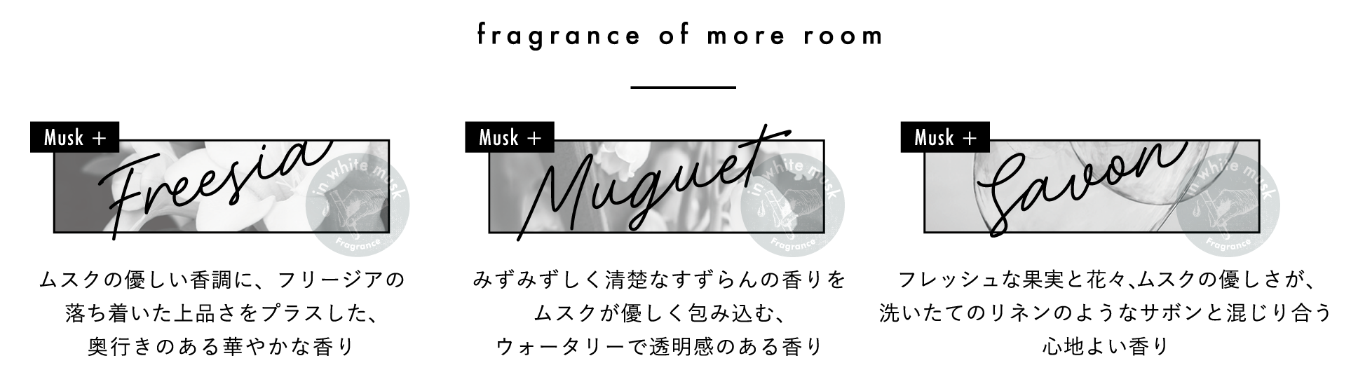 ムスクの爽やかな甘みをベースに、落ち着きのある花々やサボンを合わせた清潔感のある香りが特徴のmore room。
