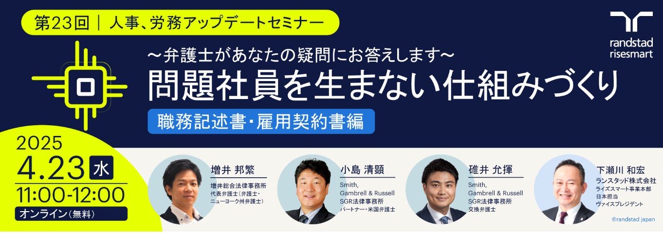 総合人材サービスを提供するランスタッド株式会社(本社:東京都千代田区 代表取締役社長 猿谷哲)は、2025年4月23日(水)11:00~12:00に問題社員の発生を未然に防ぐための施策について学ぶセミナーをオンライン開催いたします。日米の法律を知る弁護士の先生方をお迎えし、実例等を踏まえて解説する人気のシリーズで、今回は「問題社員を生まない仕組みづくり:職務記述書・雇用契約書編」と題し、組織課題の解決に向けたより具体的なケースを取り上げるとともに、日本と米国でどのような違いがあるのか比較しながら解説いたします。