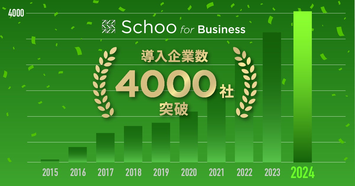 2015年からサービスの提供を開始した「Schoo for Business」。近年の人的資本経営への関心が高まりなども受け、この度2024年6月に累計導入企業数4,000社に到達いたしました。人的資本を最大化させる上では、企業が個人のキャリア自律を後押しし、そのために必要な多様な学びを支援することが重要です。当サービスでは、生成AIをはじめとするデジタル分野や、ビジネスパーソンとして必要なPCスキル、リベラルアーツに加えデザイン力や思考術など、業界の最先端の知見を有する講師による学習コンテンツを約8,500本提供しています。一人ひとりのキャリアや学びたいスキルが多様化する社会において、それぞれに必要な学びを見つけられる幅広い学習コンテンツの提供に努めると共に、学び続ける組織の実現に向けてお客様への伴走支援を行っています。今後も当社では、社員の自律的な学びやリスキリングを支援し、企業の人的資本経営を後押ししてまいります。