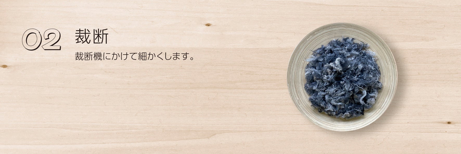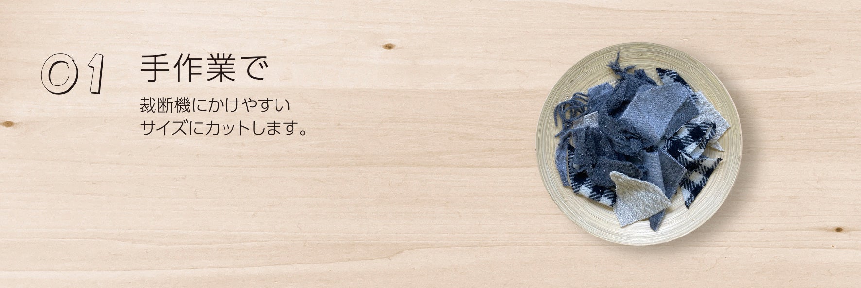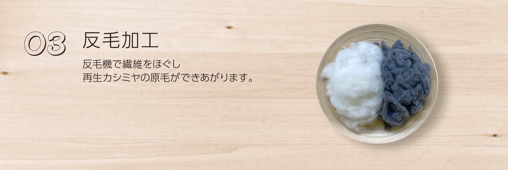 裁断、粉砕、反毛といった工程を経て、バージンカシミヤとブレンド・紡績することで再生糸にし、その糸から新たなカシミヤ製品を製造することで廃棄物の量を削減するだけでなく、半永久的にカシミヤのリサイクルが可能となる資源が循環する社会の実現に貢献します。