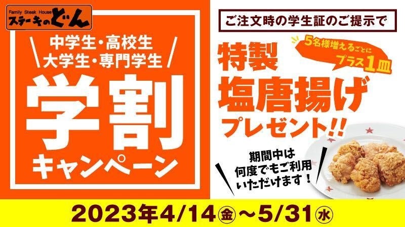 株式会社アークミール(本社:埼玉県さいたま市、代表取締役社長:柳 先)が運営する「ステーキのどん」では2023年4月14日(金)より全国60店舗で「学割キャンペーン“特製塩唐揚げ”プレゼント」を実施し、新年度を迎えて友達づくりや部活、勉強などを頑張る学生の皆様のお食事を応援します。