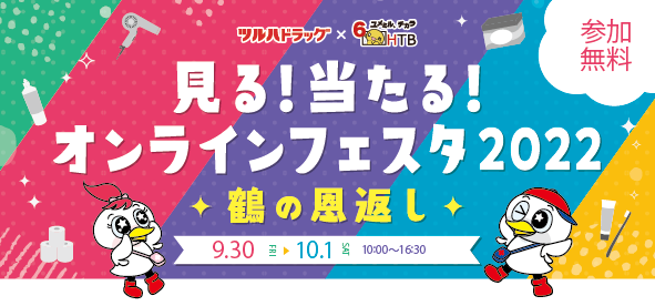 さらに、「鶴の恩返し」として、素敵なプレゼントも当たります。ツルハドラッグアプリ会員ならではのWチャンスも。ツルハ×HTBオンラインフェスタ〜鶴の恩返し〜。参加無料です。9月30日(金)、10月1日(土)はオンラインでお楽しみください!