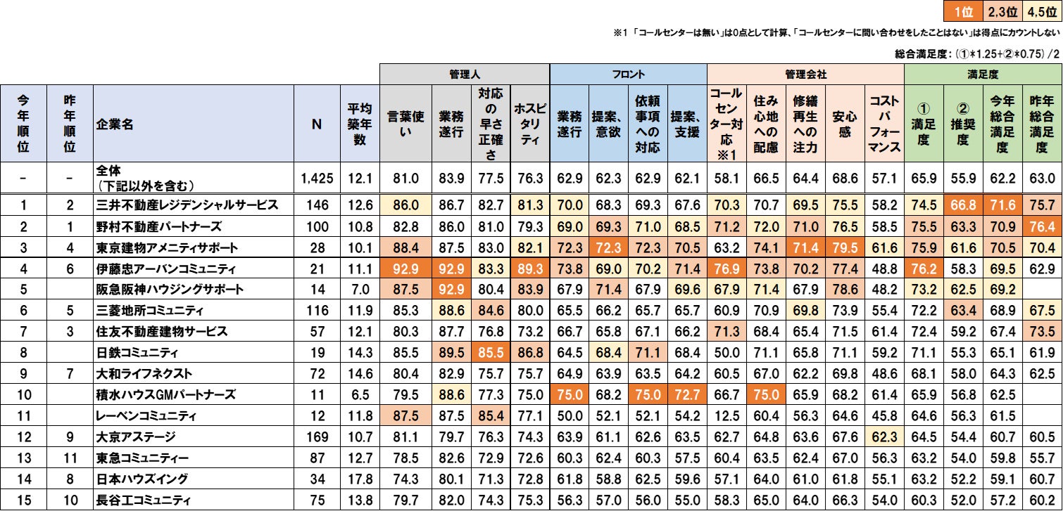 居住者による第15回「マンション管理会社満足度ランキング」公表