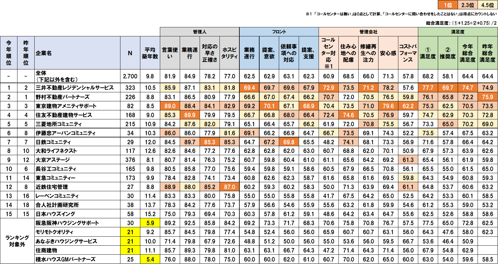 ■有効回答数:2,700(サンプル数20件以上の管理会社を公表。ランキングは回答数25件以上、かつ平均築年が回答全体平均と著しく乖離していない会社に限り対象)