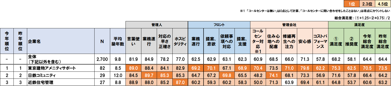 また、日鉄興和不動産グループの日鉄コミュニティが今年も(1)管理人に対する高い評価に加え、(2)フロント(3)管理会社においてもTOP5に入る結果となった。例年、同項目に高い満足度を得られている。