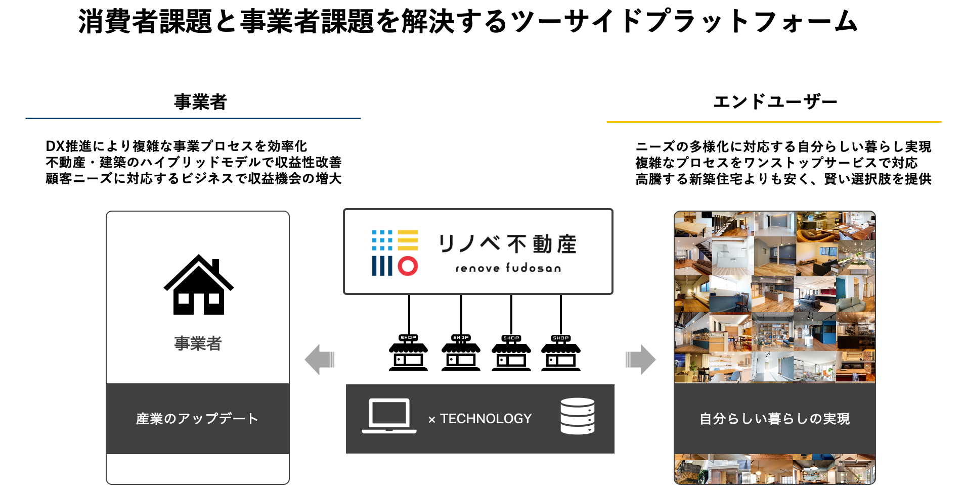 「中古仲介+リノベーション」のワンストップサービス市場シェアNo.1*の「リノベ不動産」の運営、また業界特化型マーケティングオートメーションの開発など、IT×リアルを融合した中古住宅プラットフォーム事業を推進しています。