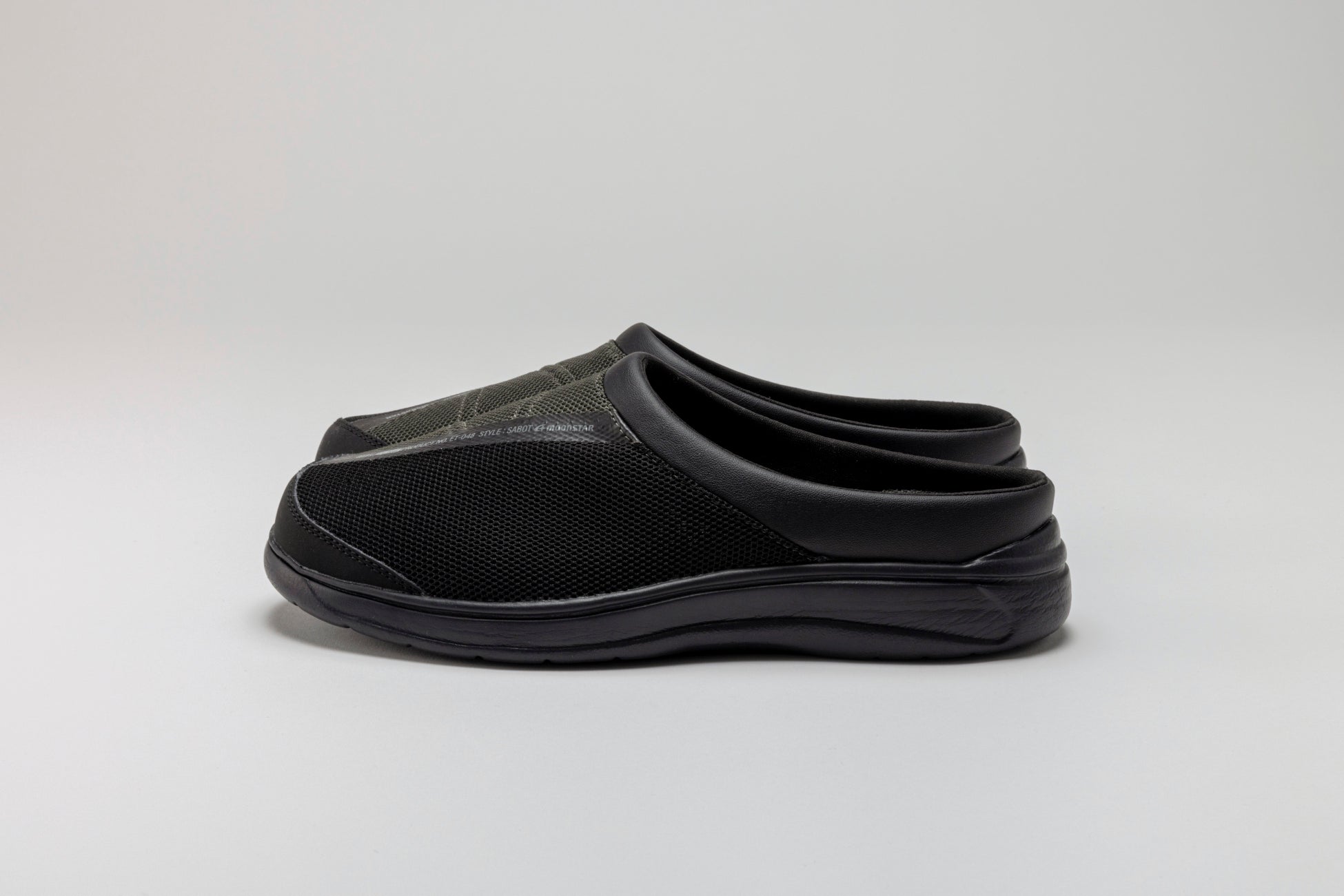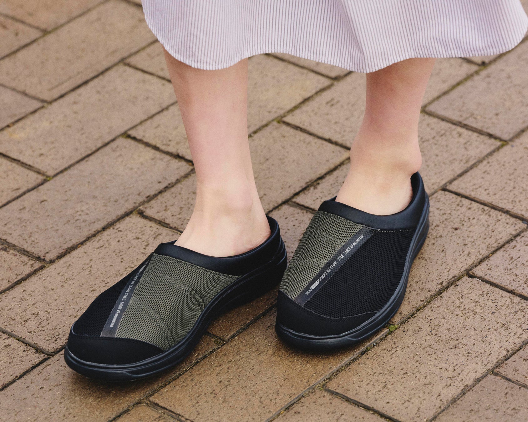 CAFをベースに使い勝手の良さを探求しアレンジ。アッパ一部分に通気性の優れた2層構造のメッシュ材を配置することで快適性を向上。インソールはパンチング仕様のベースとヒールクッションの2つのパーツで構成。Ag+抗菌機能も搭載し、履き心地の良さはもちろん、利用後の清潔性にも配慮。脱ぎ履きしやすいサボタイプの25春夏シーズンリミテッドモデル。