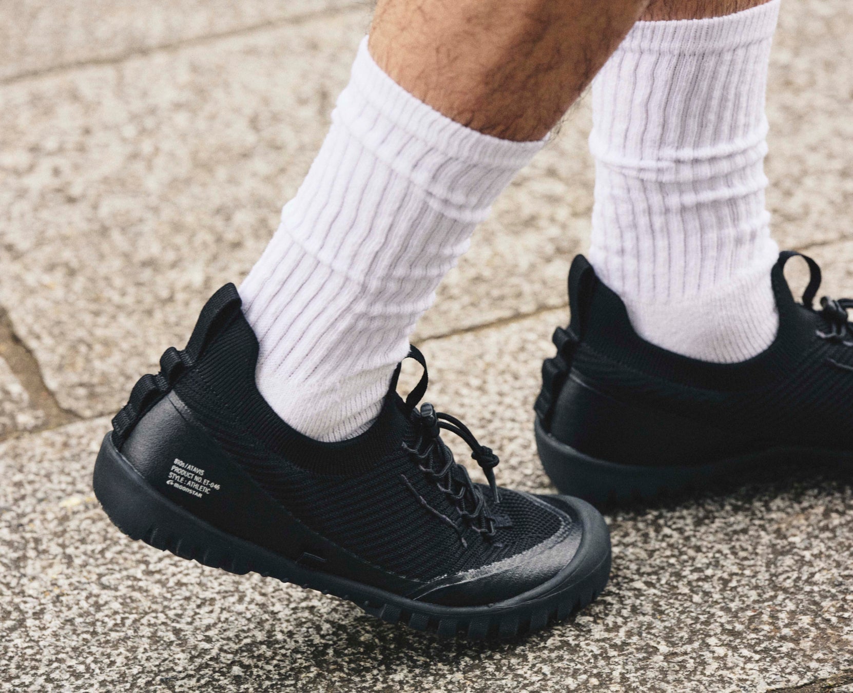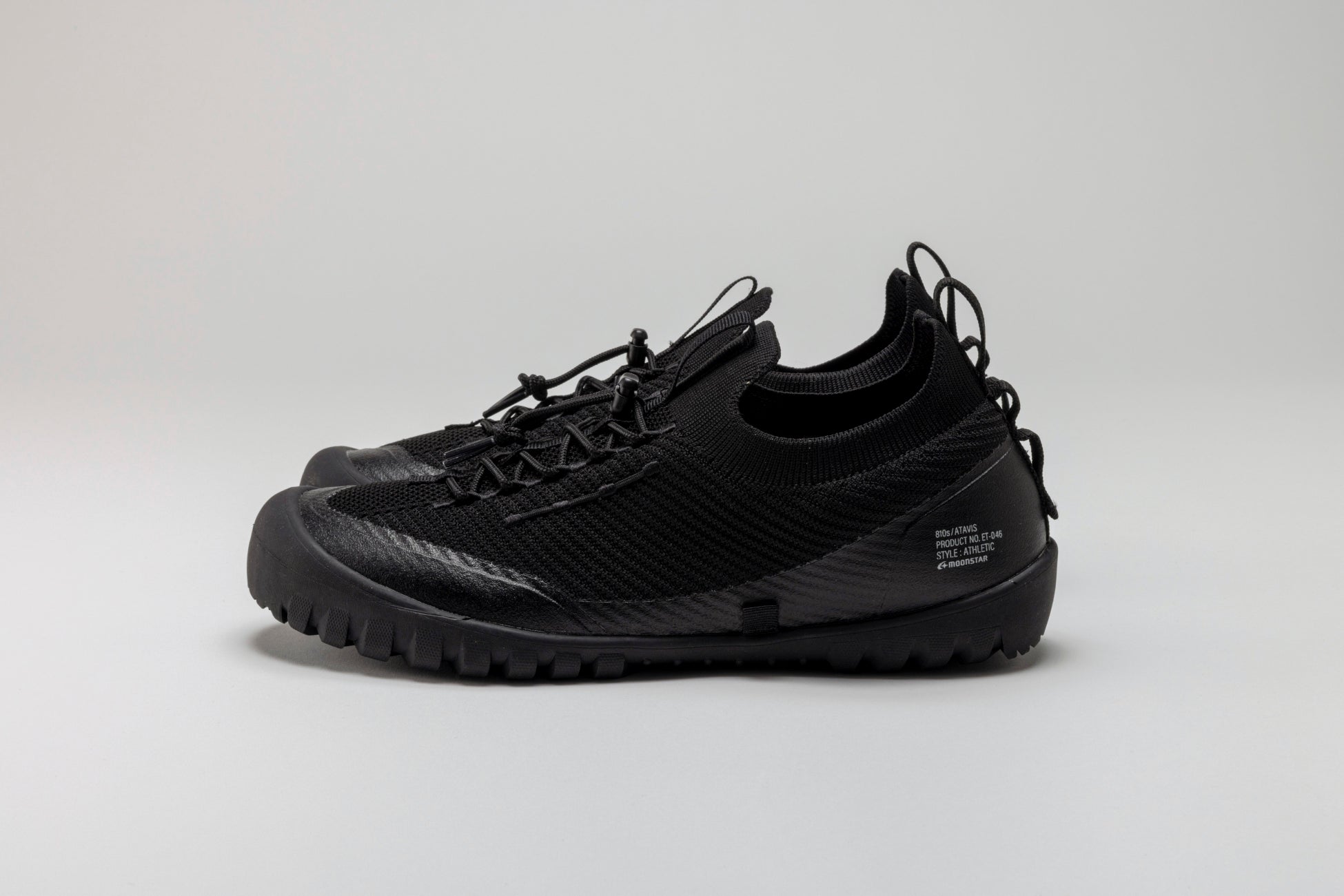ムーンスターのワークシューズの根幹である地下足袋をデイリーユースに。アッパーには伸縮性のあるニット素材を採用し、日常生活でガードが必要な箇所には補強パーツを配置。コードの通し方で用途に合わせたフィッティングに調整可能。アーチをサポートしながらも足指をしっかりと使えるインソールを搭載。アウトソールはボリュームを抑えつつ爪先を保護し、クッション性にも配慮した構造。地下足袋のようにしなやかでグリップ力を持ち、機動力に優れたアスレチックタイプ。