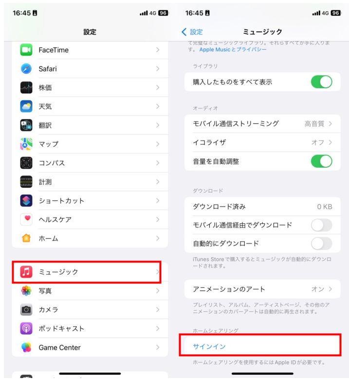 iPhoneの「設定」から「ミュージック」をタップし、「ホームシェアリング」の項目で同じApple IDを入力します。これで、iPhoneの「ミュージック」アプリでMacの音楽ライブラリにアクセスできるようになります。