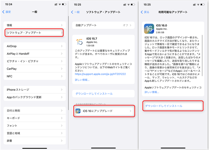 iPhoneでは、「一般」 > 「ソフトウェアアップデート」に入って、その画面でシステムバーションの更新を確認できます。最新バーションがある場合、「ダウンロードしてインストール」をタップしてください。