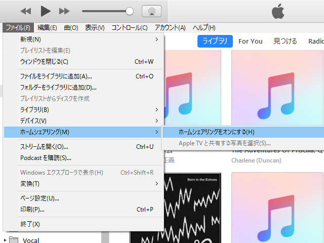 次に、MacのiTunesを開き、メニューバーの「ファイル」から「ホームシェアリング」を選択します。ホームシェアリングを有効にすると、Macの音楽ライブラリがiPhoneに表示されます。