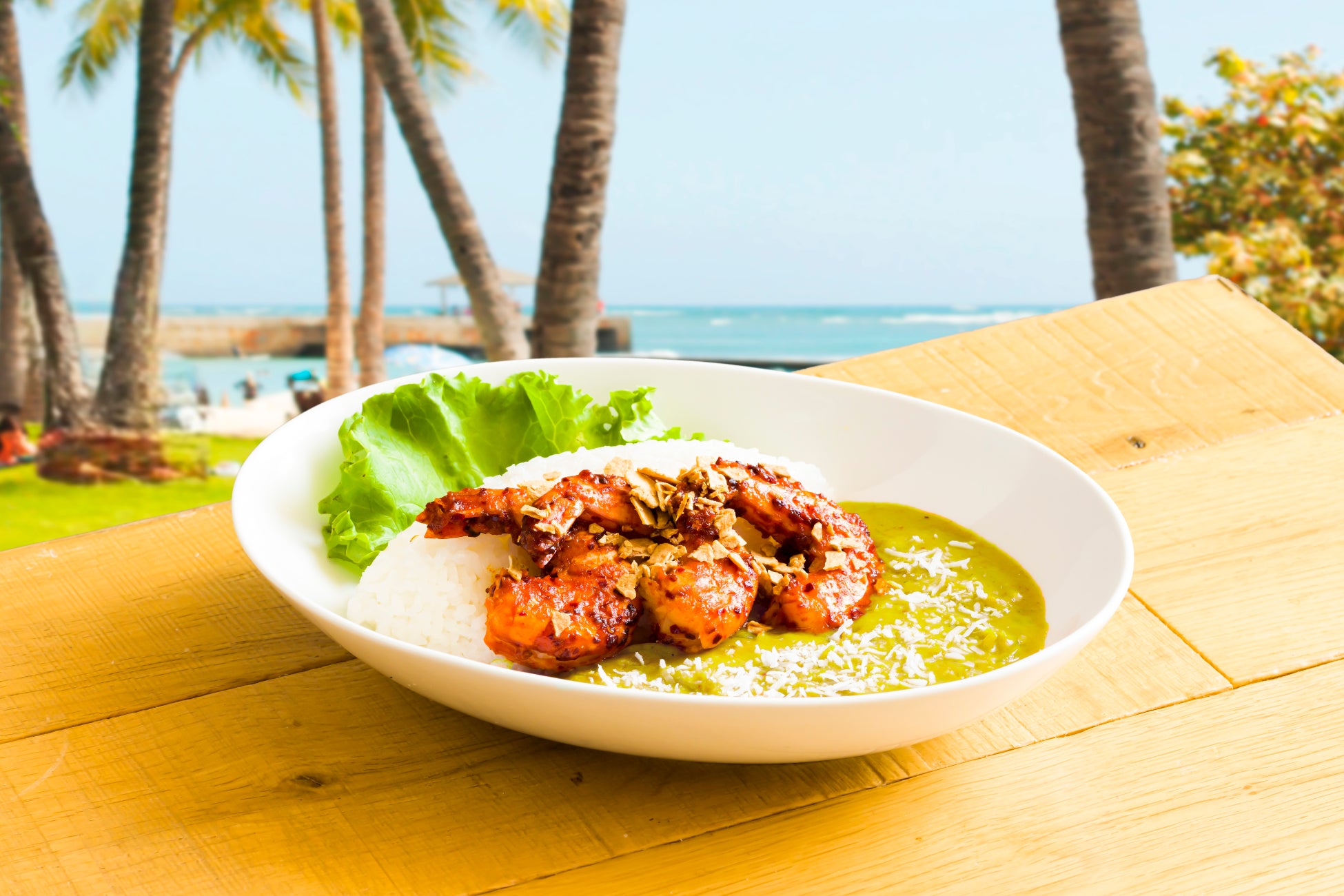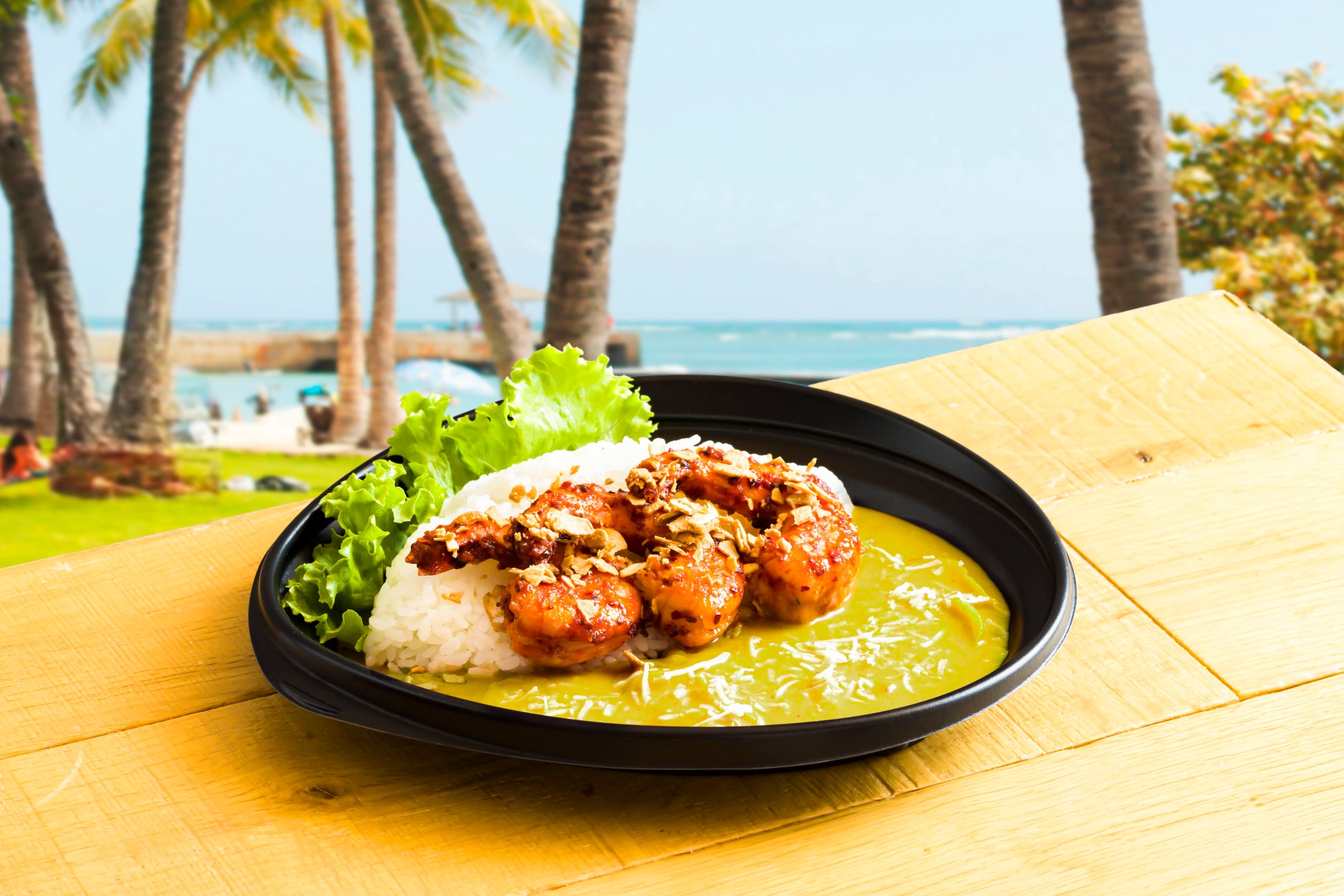 トッピングした南国気分を満喫できる一皿です。彩り鮮やかなフルーツ(パイナップル、マンゴー、イチゴ、バナナ、ブルーベリー)やふわふわのホイップクリームをのせた贅沢なパンケーキをお楽しみください。また、ガーリックシュリンプを使った真夏のカレー第二弾『ガーリックシュリンプグリーンカレー』は、辛く味付けしたガーリックシュリンプに、ココナッツの濃厚なコクを加えたスパイシーなルゥのバランスが良く、思わずもうひと口、とやみつきになるホットな美味しさです。