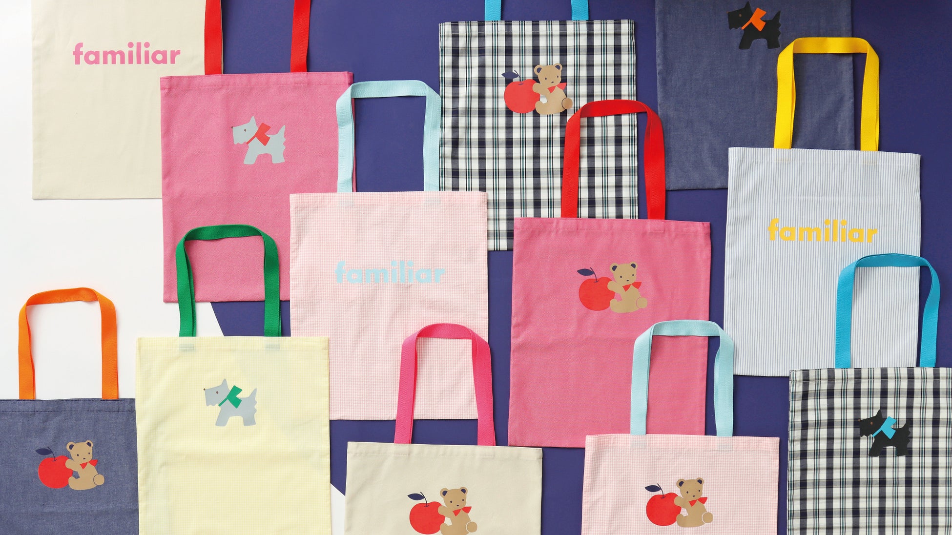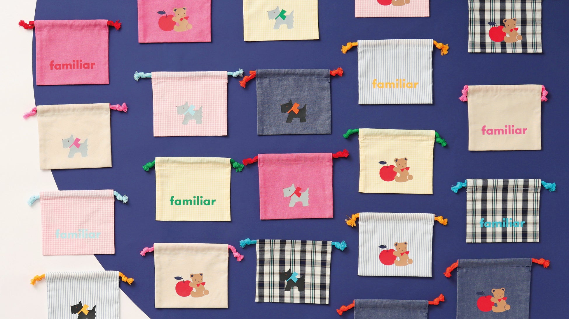 「familiar」のロゴやクマちゃん・テリアなど、ファミリアらしいワンポイントがプリントされた、シンプルでデイリー使いしやすいアイテムです。テープや紐のカラフルな配色もポイント。