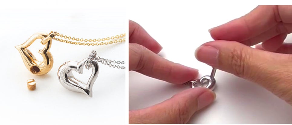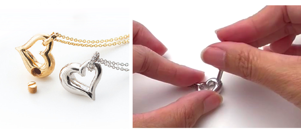 ジュエリー本体の一部が空洞になっており、ネジで開閉してご遺骨を少量納め身に着けられるインナーポケット機能付きジュエリーです。