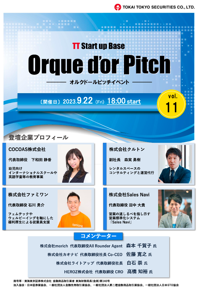 東海東京証券主催の「Orque d’or Pitch(オルクドールピッチ) vol.11」に、ファミワンの代表取締役の石川が登壇します!