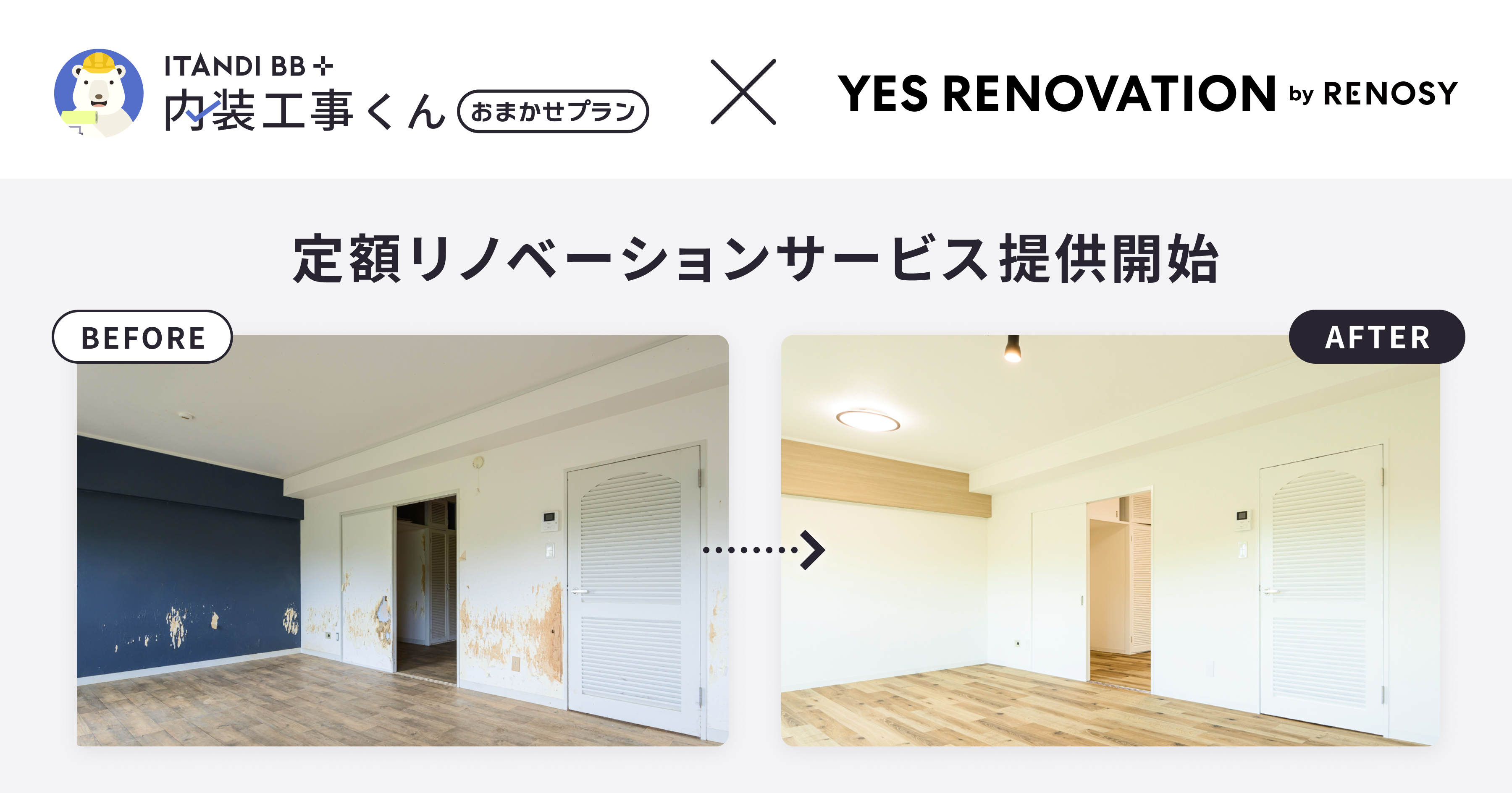 2024年8月より、賃貸物件の原状回復工事の発注・管理システム「内装工事くんおまかせプラン」は、ネット不動産投資サービス「RENOSY」が提供する賃貸専門の定額リノベーションサービス「イエスリノベーション(https://www.reno-one.com/)」と提携し、リノベーションサービスの提供を開始いたしました。