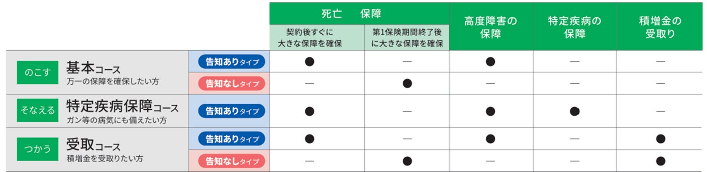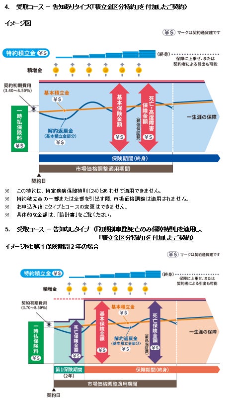 『未来につなげる終身保険v2』は、一生涯にわたって万一の保障を確保し、少しでも多くの資産を安心してご家族にのこしたいというお客さまのニーズにお応えする資産形成機能も備えた一時払終身保険です。円・米ドル・豪ドルから契約通貨をお選びいただき、お客さまのニーズにあわせて、死亡保障・高度障害保障*1のみの基本コース、ガン等の病気に備えられる特定疾病保障コース*2、必要な金額を特約積立金から引き出せる受取コースのいずれかをご選択*3いただけます。また、基本コースと受取りコースでは、契約後すぐに一時払保険料より大きな保障が確保できる「告知ありタイプ」と、契約初期の一定期間の保障を抑制し、その後の保障額を大きくすることで将来の手厚い死亡保障を確保できる「告知なしタイプ」をご用意しています。