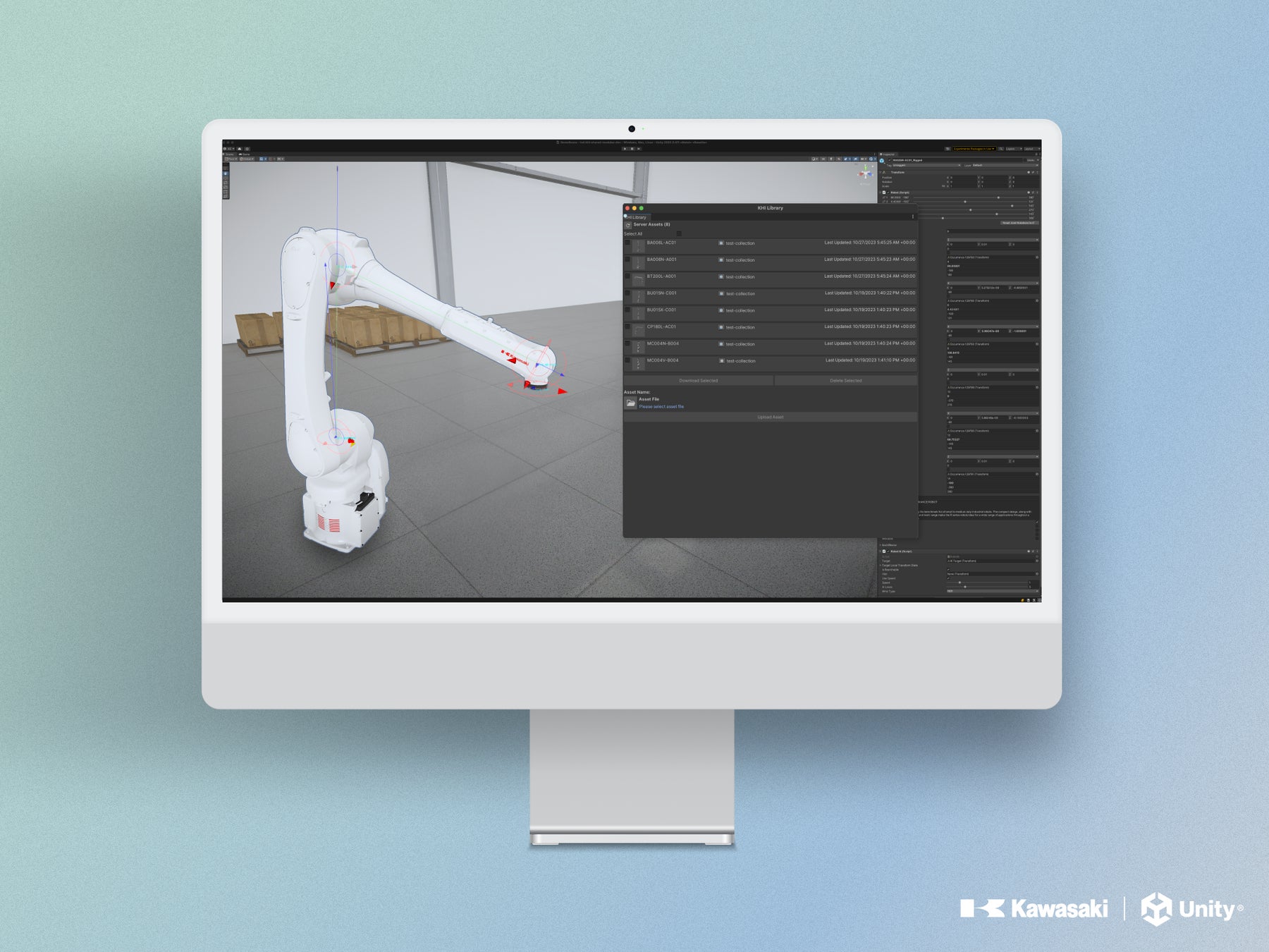 Azure上に構築されたロボットライブラリとその管理ツールで、3Dモデルや仕様情報を保存します。Unityエディターに専用機能を拡張したツールを通じ、データのアップロード、ダウンロード、削除、バージョン管理、承認ワークフローを提供。ロボットの動作確認や、コンフィギュレータやモニタリングダッシュボードなどのUnityアプリでライブラリの情報を一元管理し活用できます。