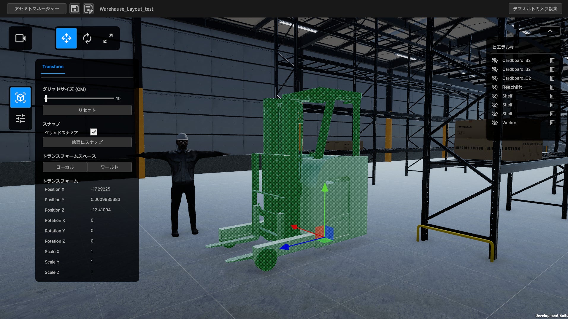 「Unity を使ったデジタルツイン環境とはどういったものなのか」をテーマに、現実世界の多様な環境や機材、人、機能をデジタル空間内で組み合わせて再現し、実際に運用できるプロジェクトです。本プロジェクトでは、3Dアセットの準備から検証、意思決定のプロセスに至るまで、多岐にわたる機能を体験できます。例えば、工場内の物流や製造に必要な3Dデータや点群データ、人物アバターデータの管理と共に、直感的な操作でアセットを配置し、干渉チェックなどの検証機能を試すことが可能です。