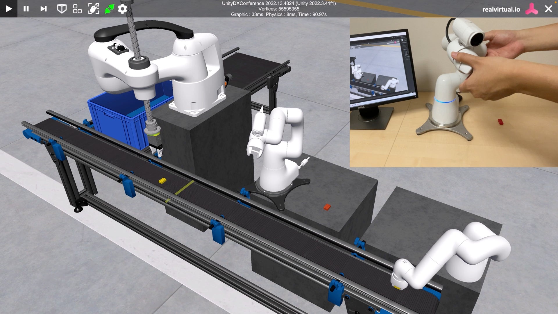 デンソーウェーブの『デジタルツインソフトウェア』は、Unity Industryに『realvirtual.io』をアドオンし、デンソーロボット製品と接続することで、3D仮想空間上でデンソーロボットや設備全体のシミュレーションを実現します。実機を使わずにレイアウト検証、設備シミュレーション、作業者トレーニングが可能となり、設備導入時の調整工数を削減。また、実機と接続して仮想空間で設備をモニターすることで設備稼働時のメンテナンス効率が向上します。Unity空間上でデジタルツイン化し、設備調整・稼働時の効率化と最適化に貢献します。