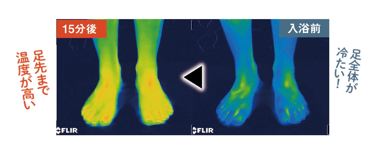 入浴前は足先まで真っ青で冷えきっていたモニターの足ですが、入浴後15分たっても温度が高く、温かさの持続力が優秀でした!