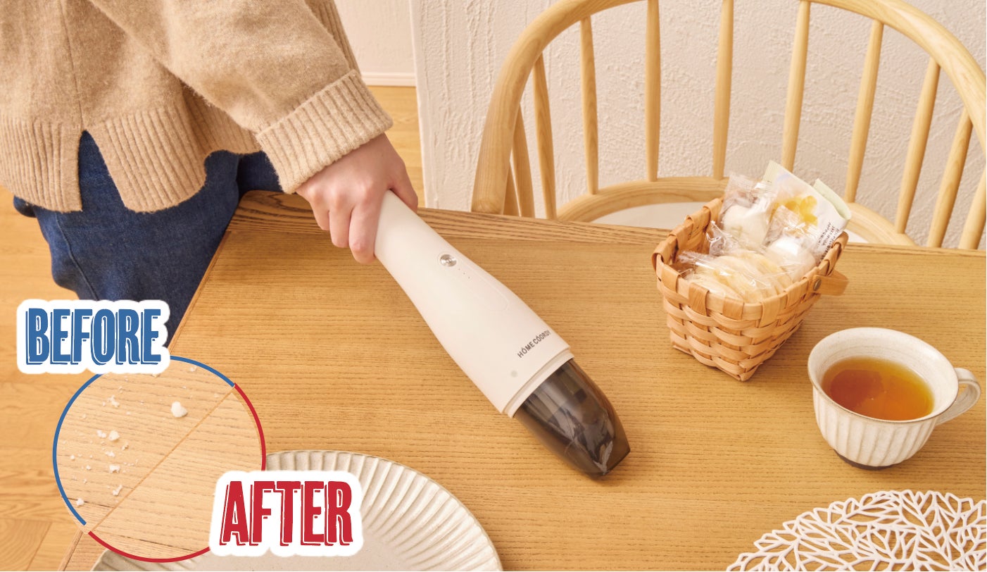 食べこぼしや髪の毛など、掃除機を出すほどではないけれど気になる汚れにサッと対応! ホームコーディはコンパクトながら気持ちいいぐらい吸ってくれるので、家中キレイが保てること間違いなし! 部屋の雰囲気を邪魔しないオシャレさも兼ね備えた一台です 。