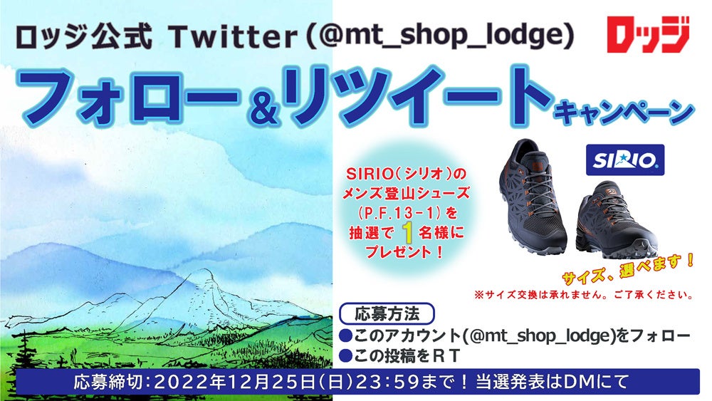 ゼット株式会社(本社/⼤阪市天王寺区、代表取締役社⻑/渡辺裕之)のグループ企業「山とアウトドア専⾨店ロッジ」は、ロッジ⼤阪店公式Twitterアカウントにて、SIRIO(シリオ)のメンズ登山シューズが抽選で当たるTwitterフォロー&リツイートキャンペーンを開催中です。