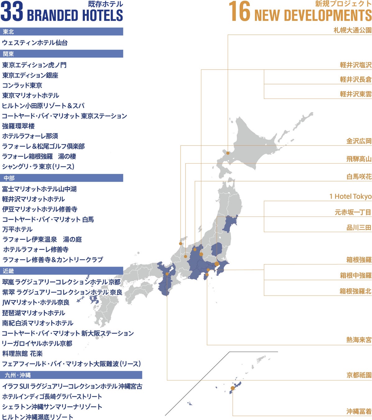 森トラストグループの中核である森トラスト株式会社のホテル&リゾート事業では、2025年3月時点で日本全国に33のホテル施設を展開、16件の新規プロジェクトを推進しています。インバウンド需要の受け皿拡大や旅行者一人当たりの消費単価向上を見据えた取り組みを推進していくなど、国内外の旅行者に日本各地の魅力ある観光資源を活かした快適な滞在を提供しています。
