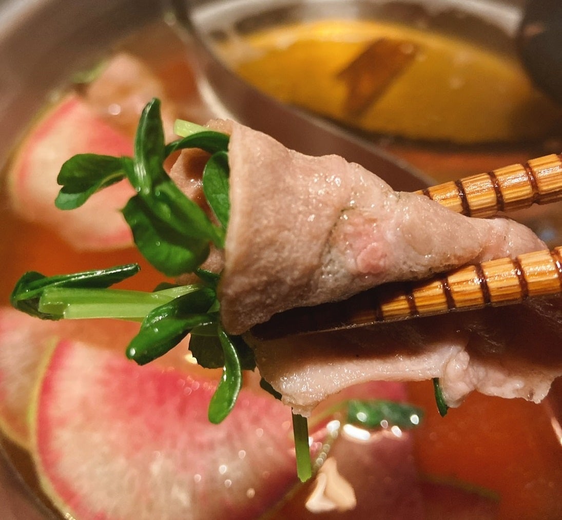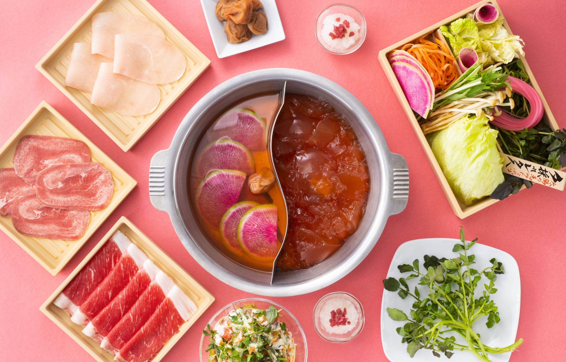 昆布と鰹でとった風味豊かな出汁に、紀州南高梅の梅肉と梅酢を加えました。梅の風味をより感じていただけるよう酸味と甘味のバランスを調整しています。鍋があたたまると紅芯大根から天然色素が溶け出して、ピンク色の鍋に変化します。しゃぶしゃぶ温野菜で、おいしい“春”をお楽しみください。