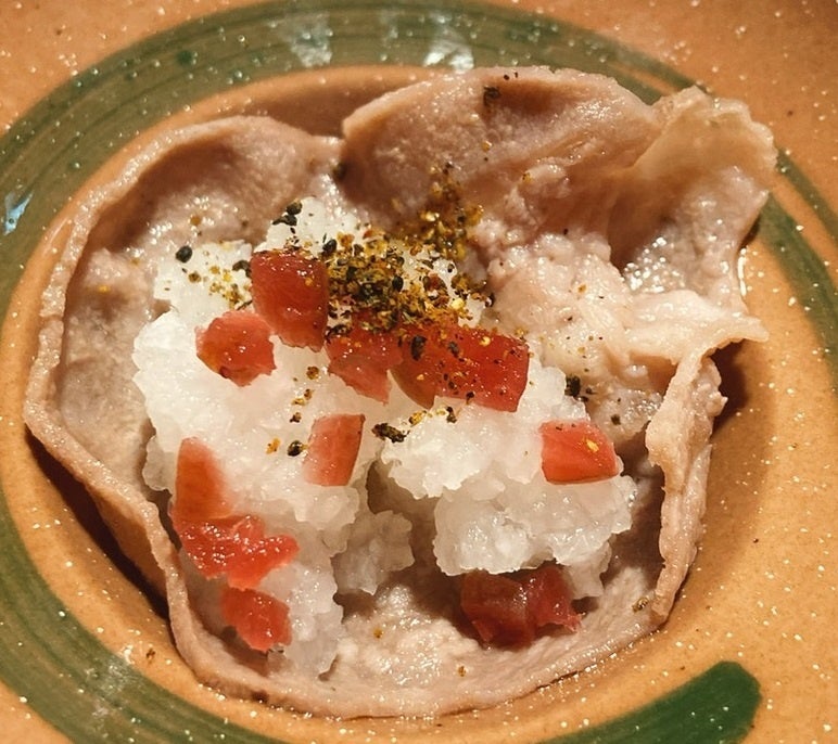 クレソンをたんしゃぶで巻いて食べる一品。たんの食感とクレソンのほろ苦い味わい、梅の風味が三位一体となった春を感じる組み合わせ。