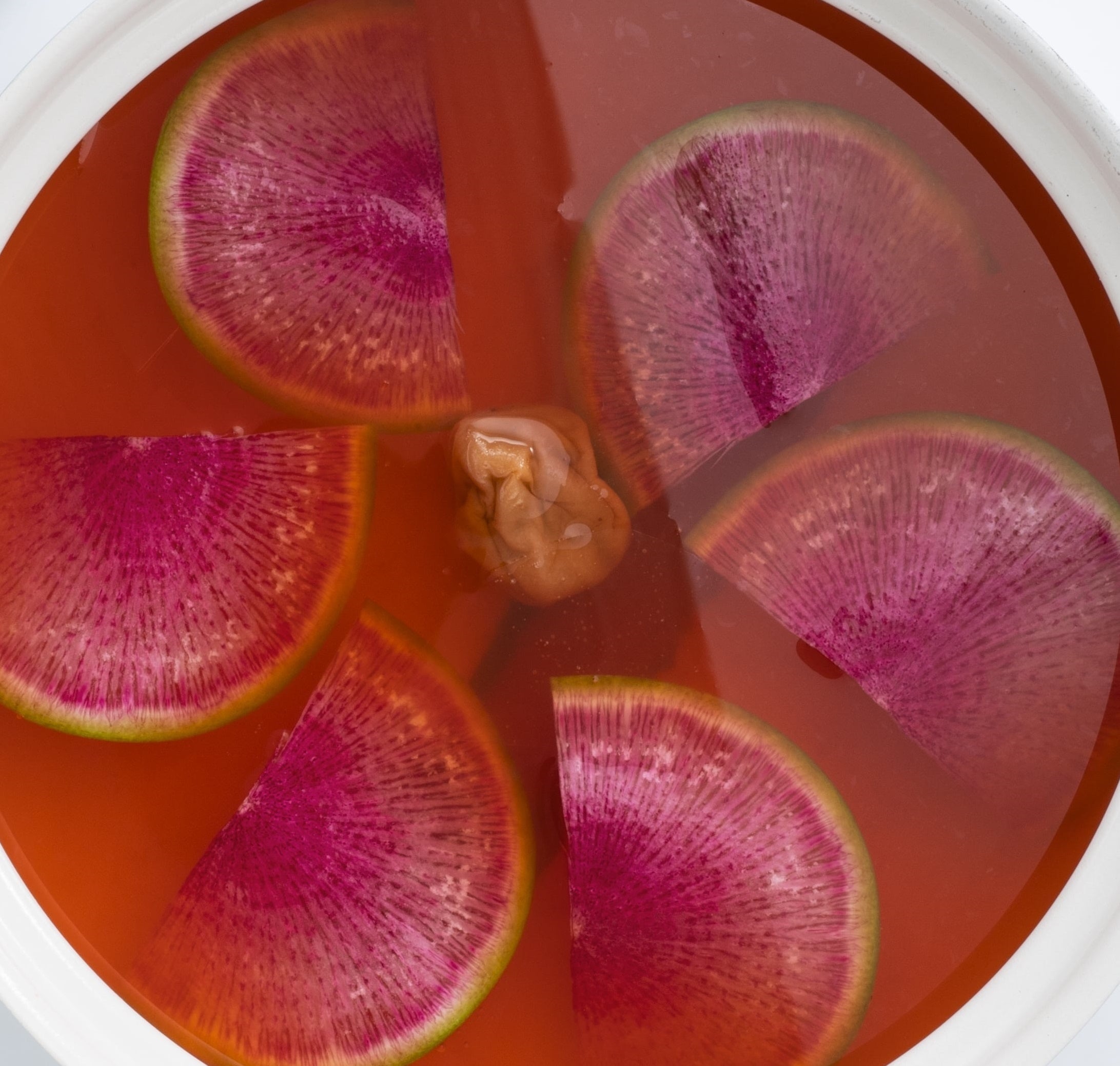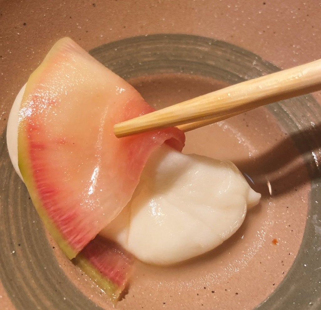 梅出汁を馴染ませた紅芯大根にとろけたチーズしゃぶしゃぶを挟んでどうぞ。まろやかな甘み・酸味の新感覚を楽しめます。
